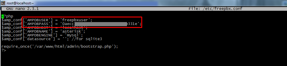 Чтобы получить доступ к mysql мы можем воспользоваться учётной записью FreePBX. Логин и пароль хранятся в файле /etc/freepbx.conf, как показано ниже: