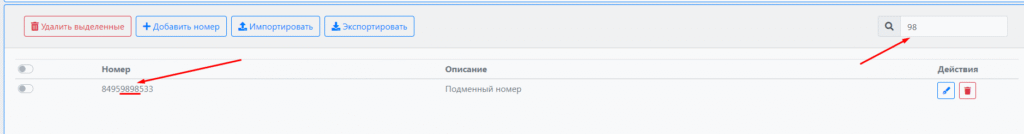 Интерфейс полностью русифицирован и нативно понятен, но давайте всё же рассмотрим основные возможности. Об удалении говорить не будем, поскольку с ним всё просто. Выделили нужные элементы и удалили массово или, при необходимости – удалим нажатием на корзинку в строке. Это позволит удалить только один конкретный номер.